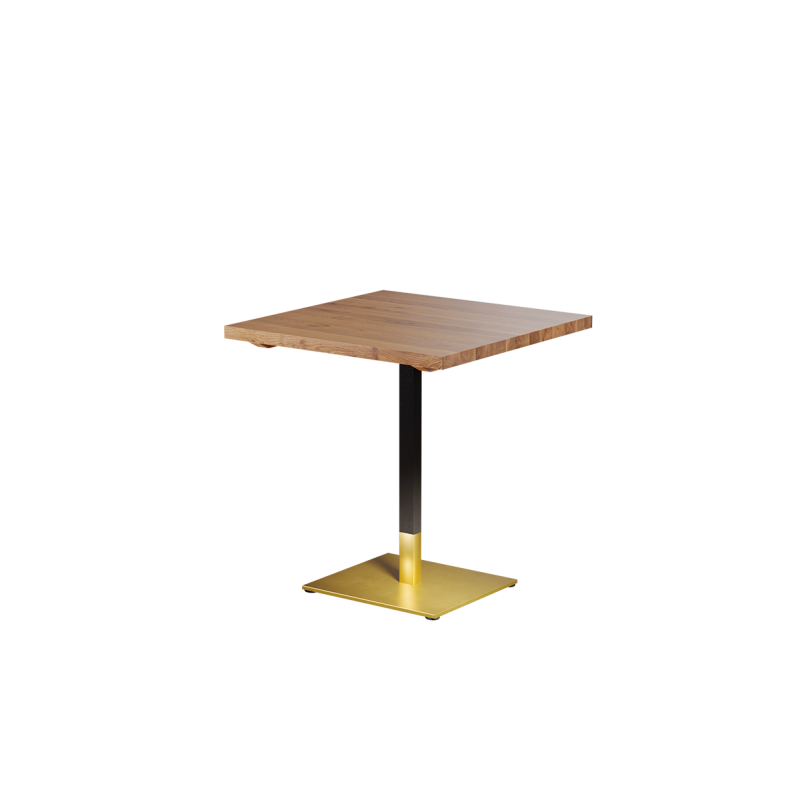 Die Basis des Holztisches OMEGA besteht aus einer Stahlkonstruktion mit gusseisernem Kern, verborgen unter einer eleganten, verchromten Ummantelung. Die Kombination aus Schwarz und Gold verleiht ihr einen dekorativen, fast schmuckartigen Charakter, ohne die Funktionalität zu beeinträchtigen. Die quadratische Säule betont die klare Geometrie des gesamten Modells, während die breite Bodenplatte ein hohes Maß an Stabilität sicherstellt.