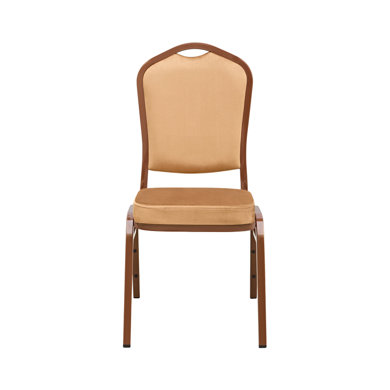 Das 5,5 cm hohe Sitzpolster besteht aus formstabilem Schaumstoff, der auch bei häufiger Nutzung nicht an Höhe oder Form verliert. Der weiche, braune Velours unterstreicht die elegante Optik des Stuhls und hält zugleich intensiver Nutzung und Reinigung stand. Diese Kombination bietet hohen Sitzkomfort auch bei langen Events und eignet sich hervorragend für Bankettsäle, in denen der Gästekomfort im Mittelpunkt steht.