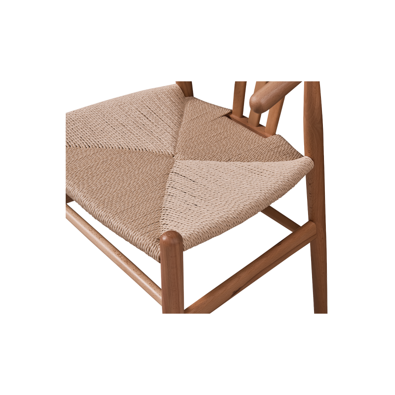 Die Sitzfläche ist aus einem geflochtenen Seil in geometrischem Muster gefertigt, was dem Möbelstück eine besondere Leichtigkeit und handwerkliche Raffinesse verleiht. Dieses Material sorgt nicht nur für eine ansprechende Optik, sondern auch für hohen Komfort und Strapazierfähigkeit. Der natürliche Farbton des Seils steht in schönem Kontrast zum dunklen Holzrahmen und schafft eine harmonische Verbindung aus traditionellem Handwerk und modernem Design.