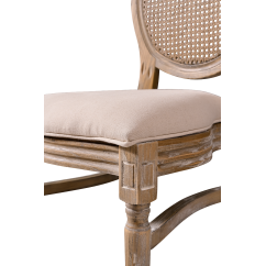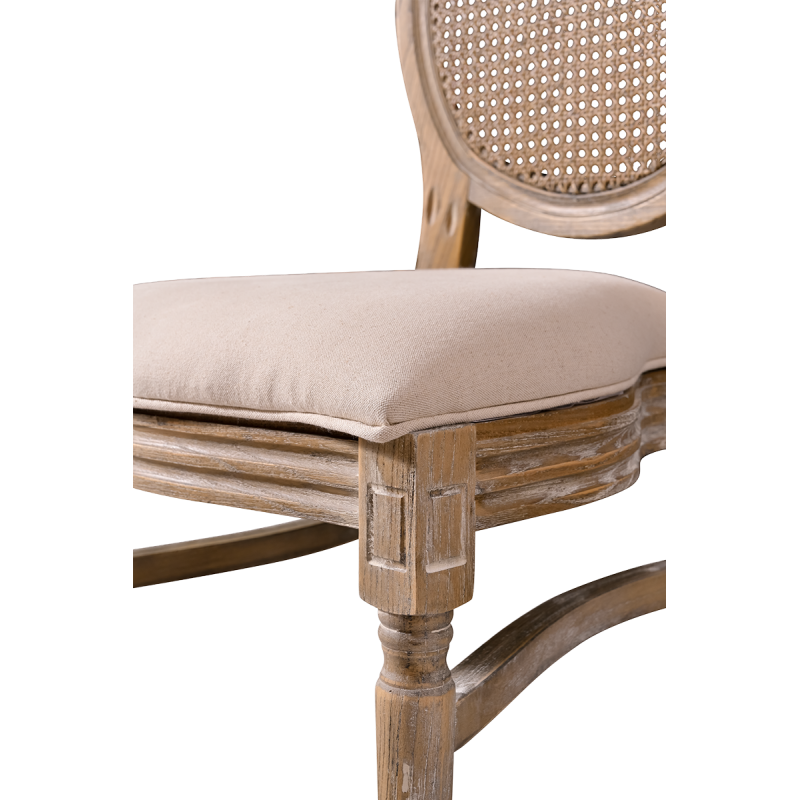 Gefertigt aus massivem Holz, bietet der Stuhl Stabilität und Langlebigkeit – ideal für den intensiven Einsatz in gewerblichen Objekten. Die Rückenlehne aus Rattan durchbricht subtil die klassische Form und verleiht ihr Leichtigkeit und Finesse. Die gepolsterte Sitzfläche sorgt für höchsten Komfort, selbst während langer Feierlichkeiten und Veranstaltungen.