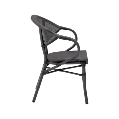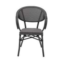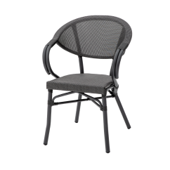 CAMILLO vereint cafétypische Leichtigkeit mit klarer Formensprache. Die ovale Rückenlehne geht fließend in die Armlehnen über und bildet eine kompakte, elegante Silhouette. Das Geflecht im Farbton Graphit verleiht dem Modell Tiefe und harmoniert hervorragend mit Holz, Stein oder Metall. Dieser Biergartenstuhl schafft in jeder durchdacht gestalteten Outdoor-Fläche eine stimmige Atmosphäre.