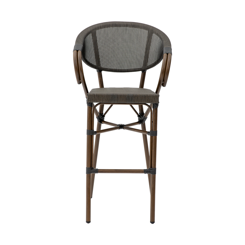 In dieser Variante des CAMILLO BAR wurden Sitz und Rückenlehne aus Technorattan- Geflecht gefertigt, das fest in die Konstruktion integriert ist und eine gleichmäßige, stabile Oberfläche bildet. Diese Ausführung bietet eine komfortable Unterstützung und angenehme Flexibilität, die besonders bei längerer Nutzung wichtig ist. Das feine, dichte Geflecht verleiht dem Stuhl einen eleganten Charakter und ist gleichzeitig für den intensiven Einsatz im Gastronomiebereich ausgelegt. Zusätzlich überzeugt das Material durch seine UV-Beständigkeit.
